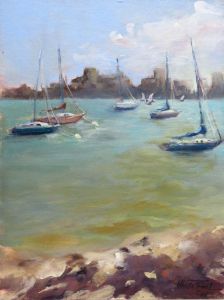 Plein air painting at Ken Thomspon Park. A hazy morning at Sarasota Bay. View towards Sarasota Skyline