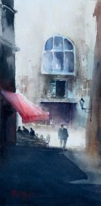 The Red Awning, watercolor on board, 16×8 inches
