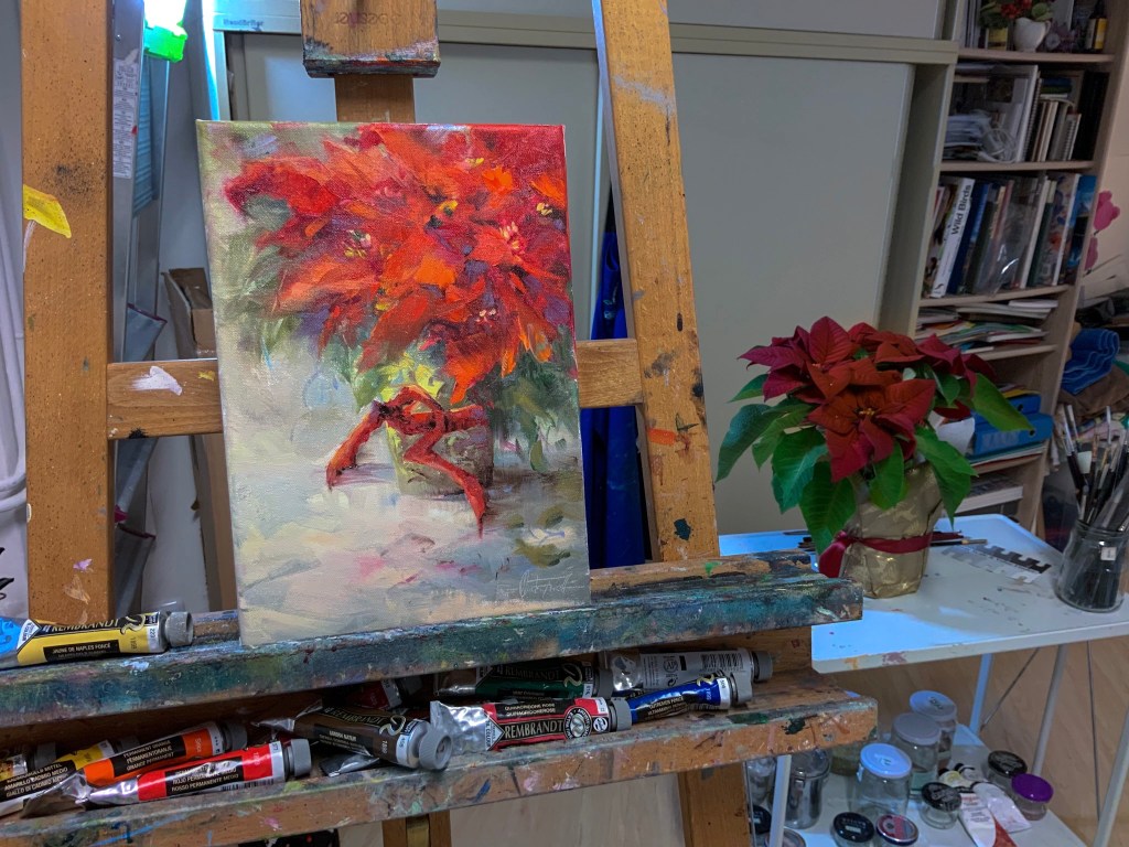 Poinsetta Day3 #stradaeasel #stradaeaselchallenge #stradaeaselchallenge2022 #oilonlinen #floral #oilpainting #paintingfromlife #artlover #christafriedl